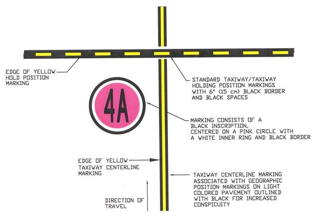 These markings are located at points along low visibility taxi routes designated in the airport’s Surface Movement Guidance Control System (SMGCS) plan. They are used to identify the location of taxiing aircraft during low visibility operations. Low visibility operations are those that occur when the runway visible range (RVR) is below 1200 feet (360m). They are positioned to the left of the taxiway centerline in the direction of taxiing.
